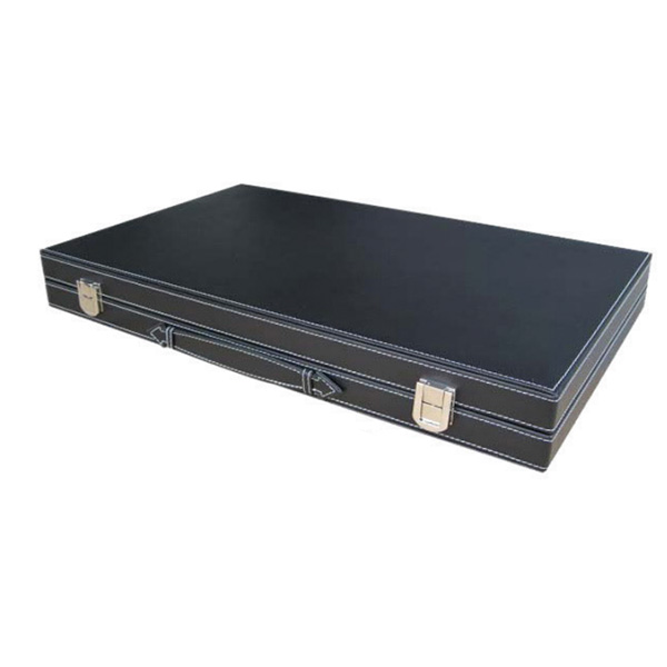 Τάβλι βαλίτσα δερματίνης πολυτελείας με πλάγιες θήκες για τα πούλια. Το εσωτερικό του έχει επένδυση ειδικό ύφασμα. Συνοδεύεται από ένα σετ πούλια τύπου φίλντισι, 4 ζάρια 15mm, ένα ζάρι διπλασιασμού 15mm, και δύο κουπάκια ζαριών.