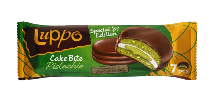 Μπισκότα Lupo με υπέροχη γέμιση κρέμας φυστικιού και βανίλιας και επικάλυψη σοκολάτας.
