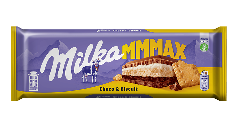 Η Milka MMMAX Σοκολάτα & Μπισκότο είναι μια ακαταμάχητη σοκολατένια απόλαυση: σοκολάτα γάλακτος με αλπικό γάλα με γέμιση κακάο, γέμιση γάλακτος και μια στρώση μπισκότων.