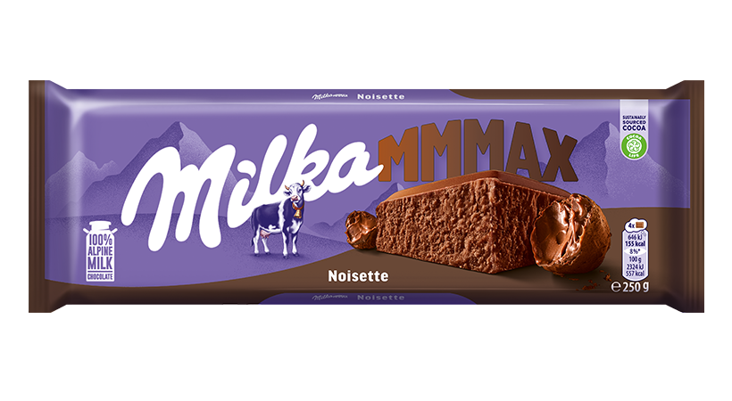 Η Milka MMMAX Noisette είναι μια σοκολάτα γάλακτος που λιώνει απαλά με 100% αλπικό γάλα και πάστα φουντουκιού.