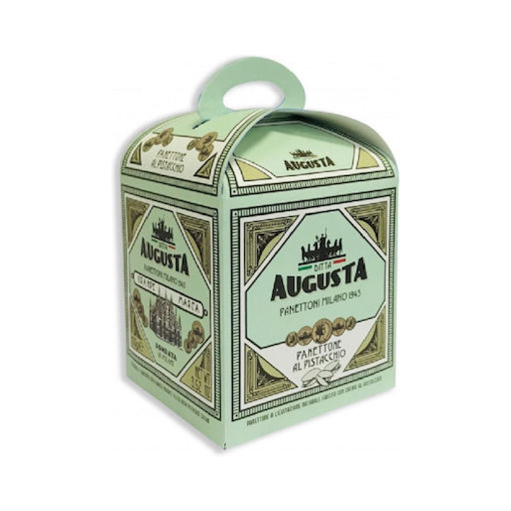 Η Augusta Panettoni ξεκίνησε το 1945 στο Μιλάνο από έναν master chef, θεματοφύλακα της παραδοσιακής συνταγής “Panettone Milano”. Σήμερα, όπως και τότε, οι κύριοι αρτοποιοί στην Augusta είναι οι θεματοφύλακες του μυστικού του ειδικού διογκωτικού, το οποίο αναμειγνύει με το καλύτερο βούτυρο στην Ευρώπη, εκλεκτά ζαχαρωτά φρούτα και την καλύτερη ποιότητα σταφίδες, μαζί με άλλα υλικά πρώτης επιλογής. για να δώσει ζωή σε αυτό το νόστιμο Pistachio Panettone. Η ζύμη αφήνεται να φουσκώσει φυσικά, στη συνέχεια μαγειρεύεται αργά και προσεκτικά και αφήνεται να κρυώσει για δώδεκα ολόκληρες ώρες, δίνοντας στο κέικ τη μοναδική του γεύση.