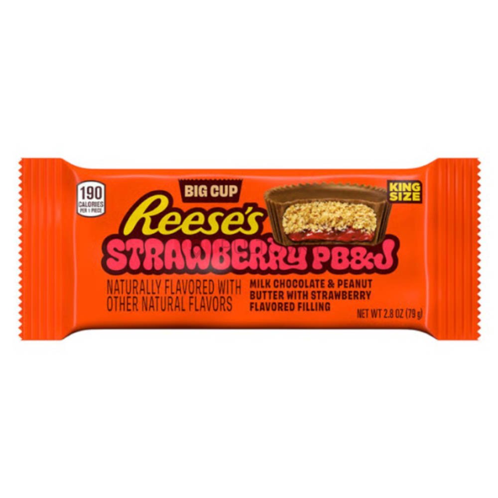Τα King Size Reese's Big Cup PB&J – Φράουλα με Φυστικοβούτυρο προσφέρουν μια νοσταλγική πινελιά σε ένα κλασικό αγαπημένο πιάτο. Αυτές οι μεγάλες λιχουδιές συνδυάζουν κρεμώδες φυστικοβούτυρο με μια γλυκιά στρώση με γεύση ζελέ φράουλας, όλα τυλιγμένα σε πλούσια σοκολάτα γάλακτος.