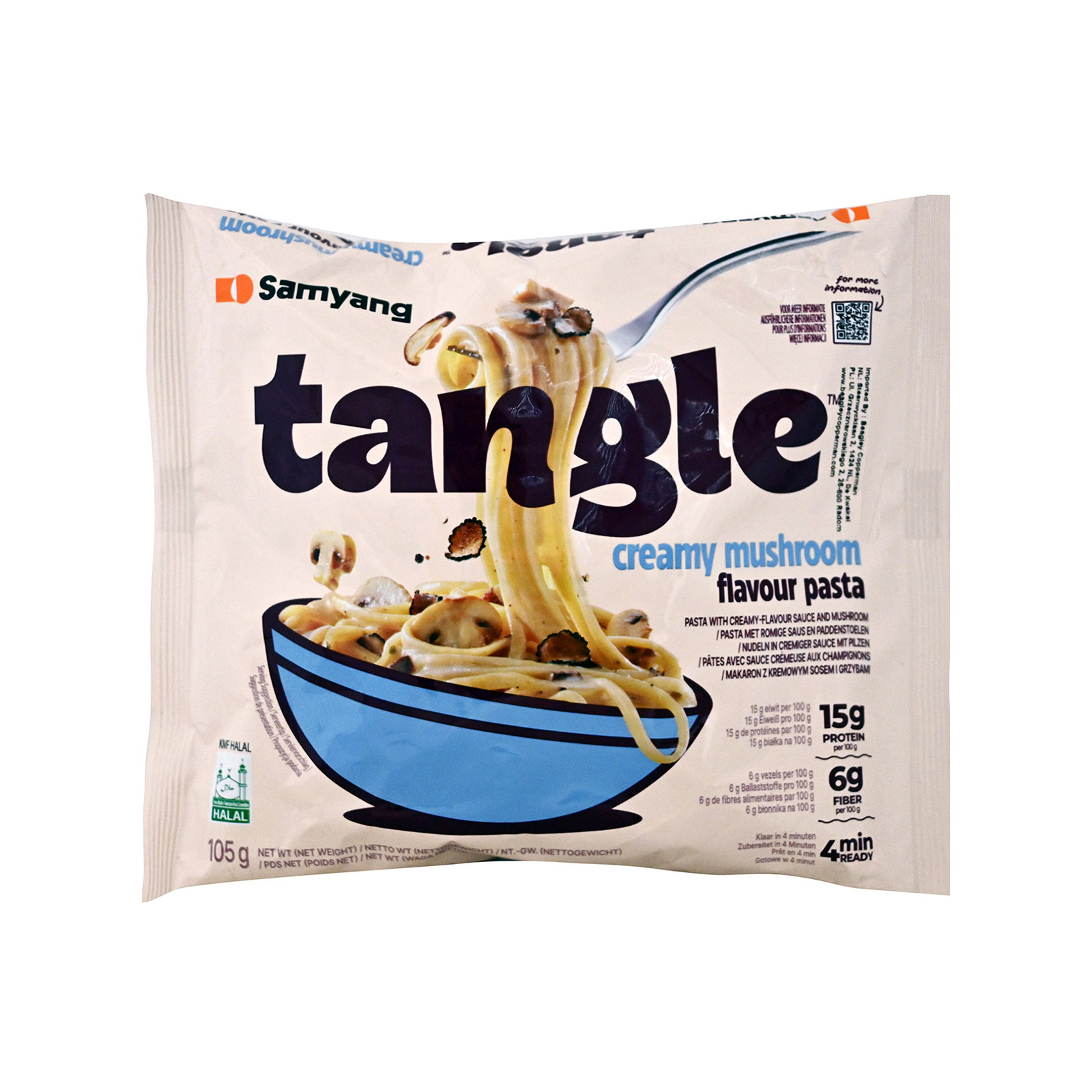 Τα Samyang Tangle Creamy Mushroom Pasta 105g είναι ζυμαρικά τύπου linguine με κρεμώδη λευκή σάλτσα. Η σάλτσα εμπλουτίζεται με shiitake μανιτάρια και διαθέτει άρωμα τρούφας.